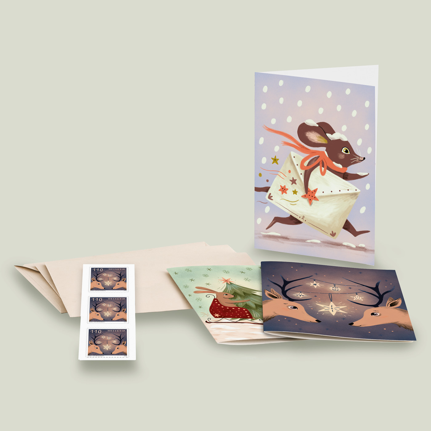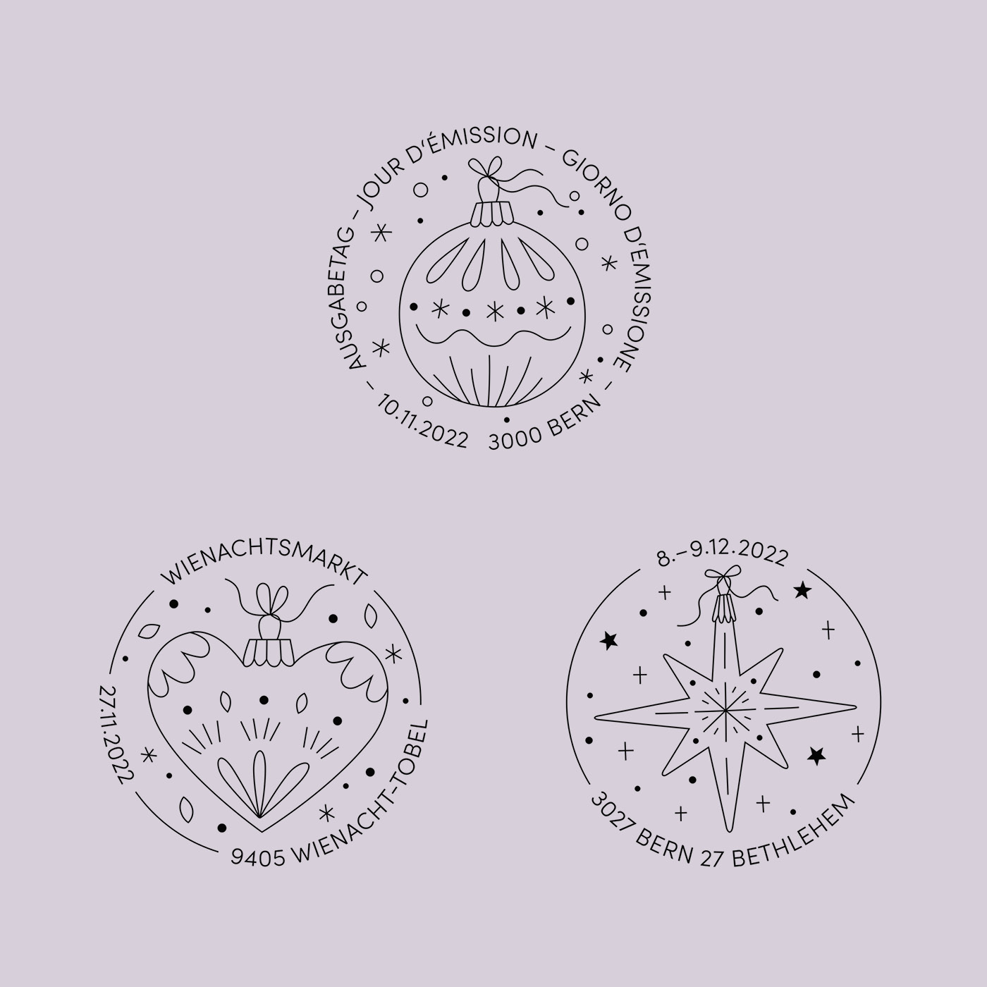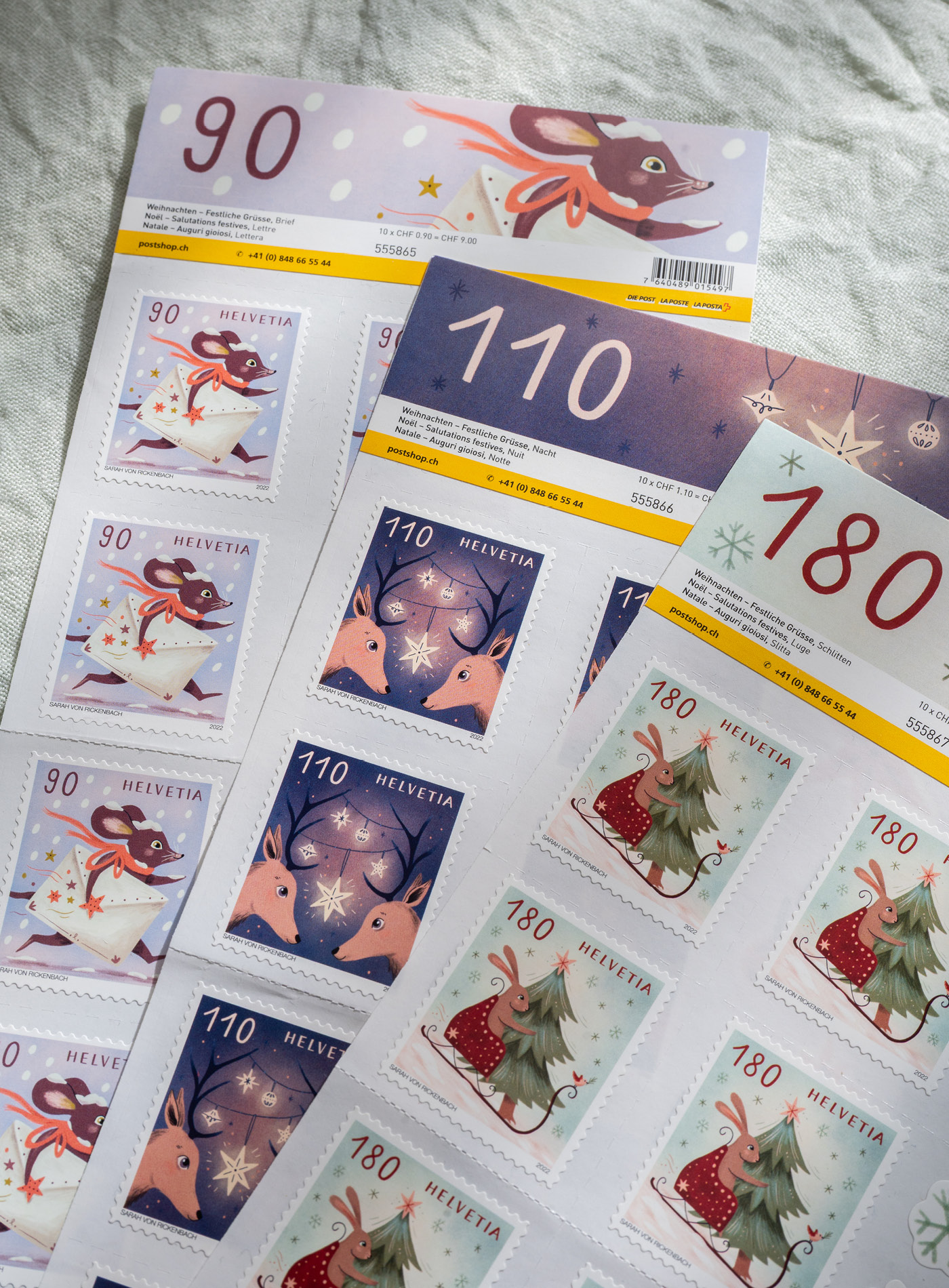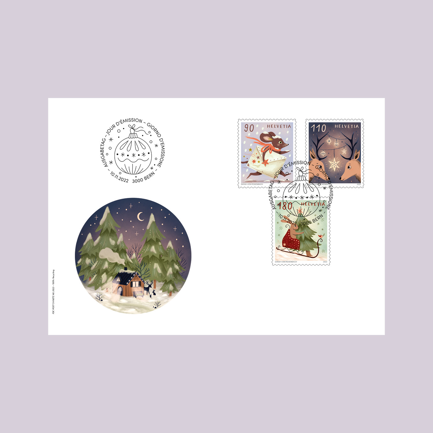 Ich wurde als eine von drei Illustratorinnen eingeladen, die offizielle Briefmarkenserie für Weihnachten 2022 zu entwerfen. Bei einem Voting unter allen Mitarbeitenden der Schweizerischen Post hat sich mein Vorschlag durchgesetzt und so durfte ich die Briefmarkenserie sowie alle weiteren Kommunikationsmittel für die Weihnachtsmarken umsetzen.