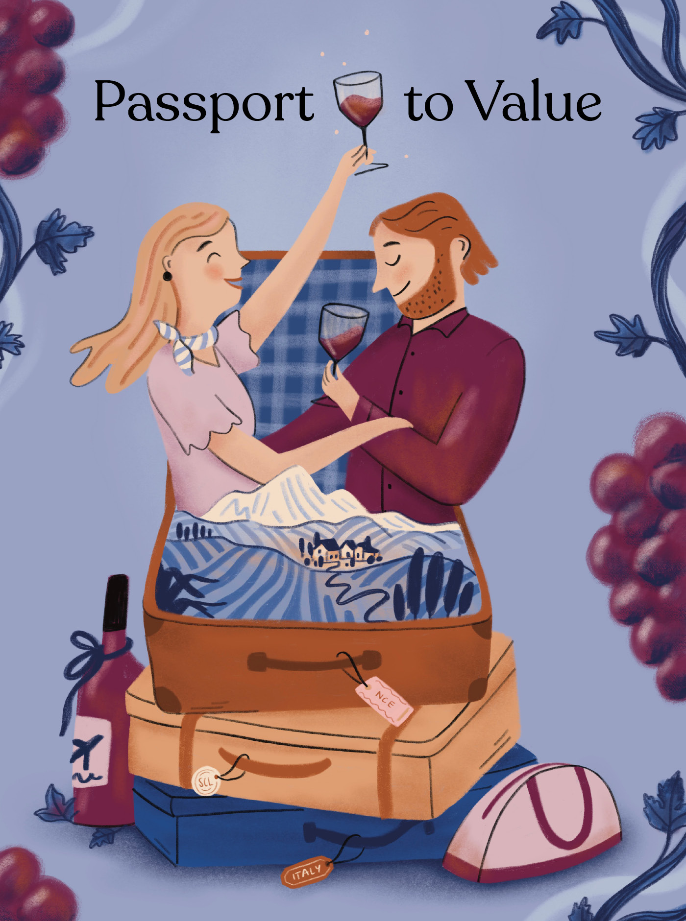 Editorial Illustrationen für einen Artikel mit dem Titel „Passport to Value”. Ein Beitrag, der sich mit den preiswertesten Weinen aus aller Welt befasst und die Vielfalt, Qualität und Geschichten hinter den globalen Weinregionen beleuchtet.