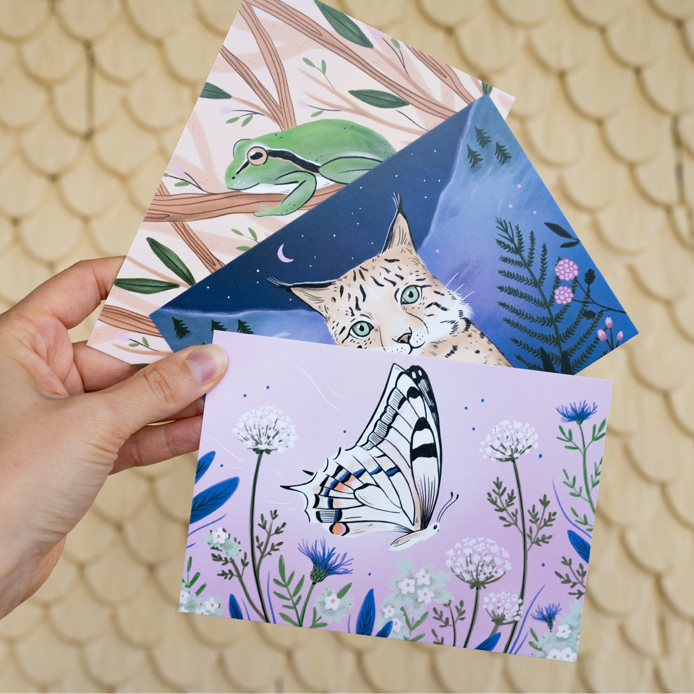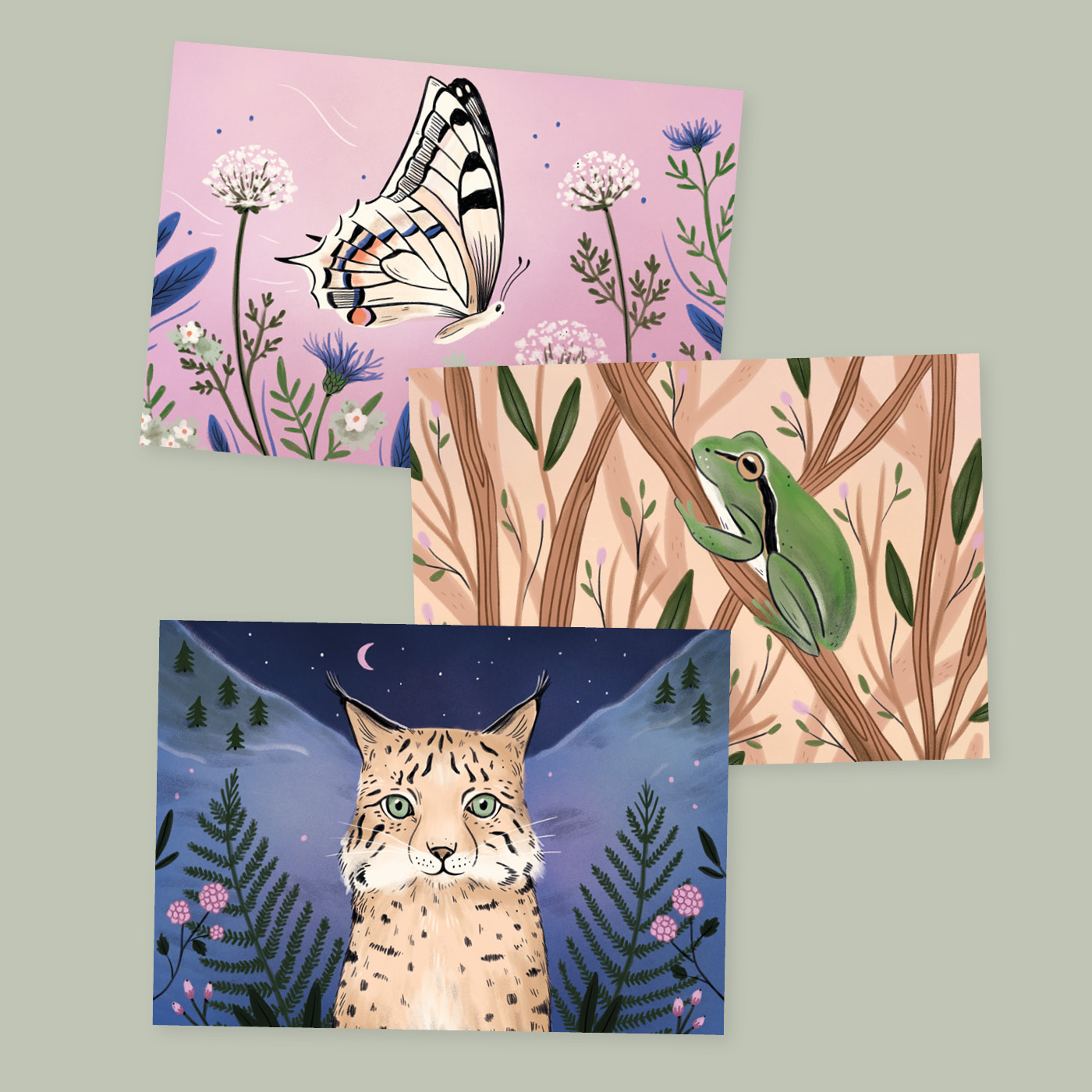 In Zusammenarbeit mit der Schweizerischen Post und Pro Natura habe ich ein Sommer-Postkartenset entworfen. Im Zentrum der Karten stehen 3 vom Aussterben bedrohte Tiere aus der Schweiz: Der Luchs, der Schwalbenschwanz und der Laubfrosch.🌿🐸